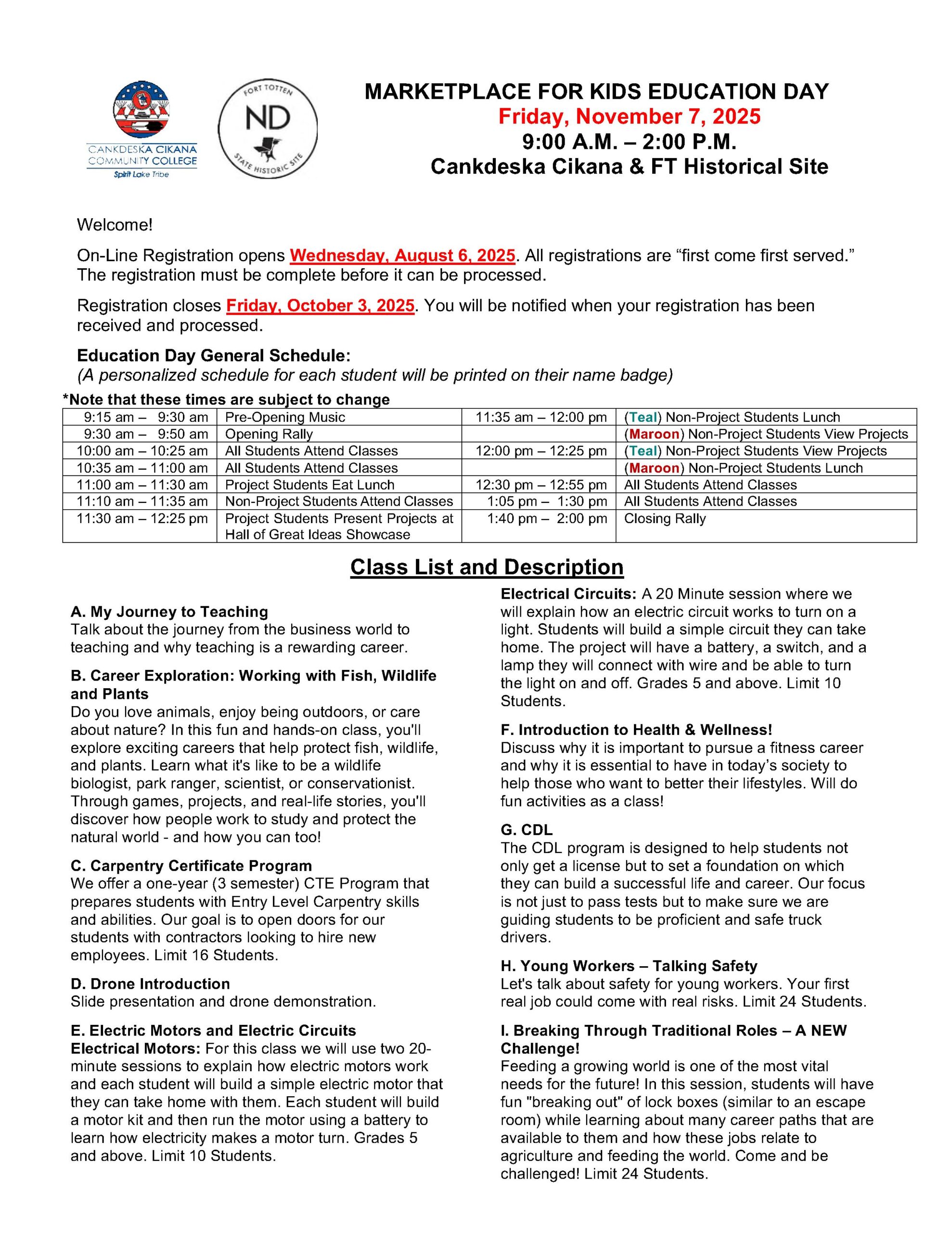 Classes subject to change. Class selections are on a first-come, first-served basis. Check back for updates.